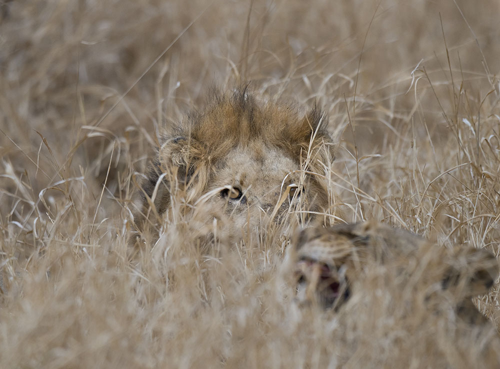 Nearby in the grass a pair of mating lions lie concealed in the grass.