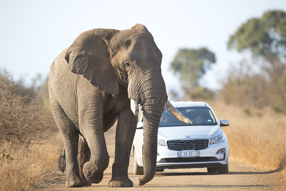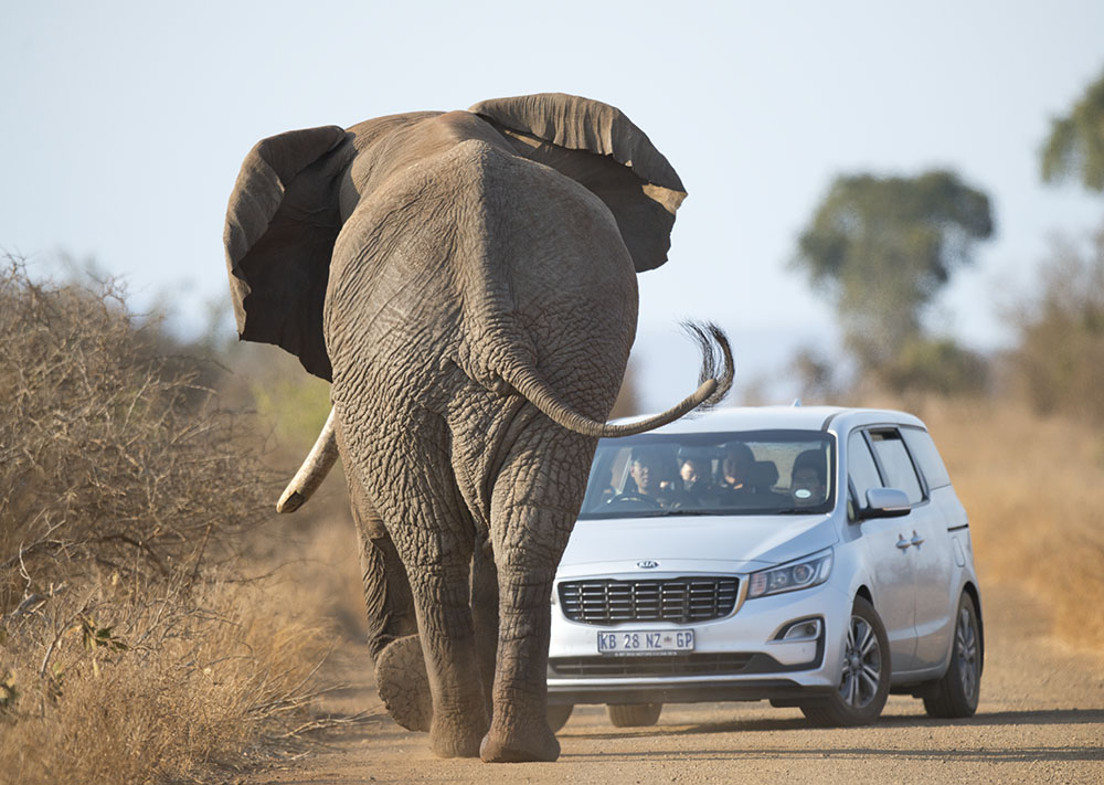 A little further on our way is blocked by this huge bull elephant. Amazingly this carload of Japanese people drove right up to this old chap and hardly backed off when he turned on them. “Ignorance can sometimes be real bliss”.
